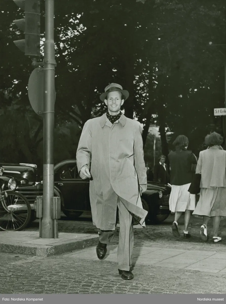 En leende man med ljus rock, prickig halsduk och hatt passerar en gata med trafikljus. I bakgrunden bilar och fotgängare. text på baksidan med blyerts: "GC Sept 1950".