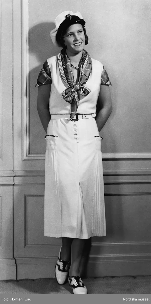 Konfektion. Modell i studentklänning med råsidendetaljer och studentmössa.