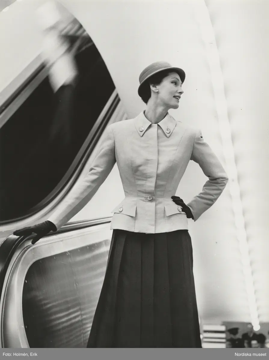 Modell i ljus jacka, veckad kjol, hatt och handskar vid rulltrappa. Original Patou.