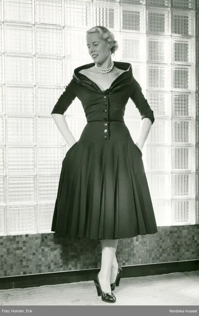 EM, Modellbutiken, Nordiska Kompaniet. Uppvisning i lunchrummet. Damkonfektion. Modell bär klänning i svart ylle med duchesse.