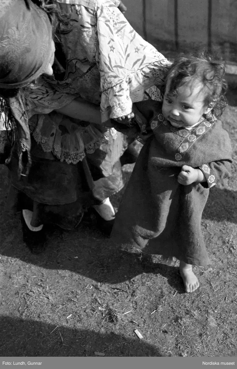 En liten flicka i klänning och bara fötter. Bredvid henne böjer sig en kvinna ned. Familjen Taikons läger i Johanneshov, södra Stockholm.