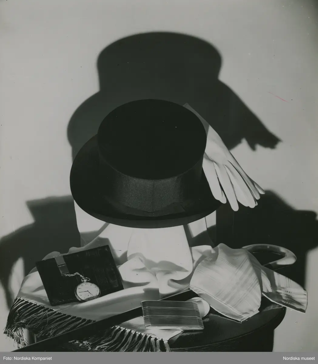 Herrkläder och tillbehör. Hatt, näsduk, plånbok, fickur, käpp, scarf. Text med blyerts på baksidan: "M-sekt. div. bilder Sept 1931"