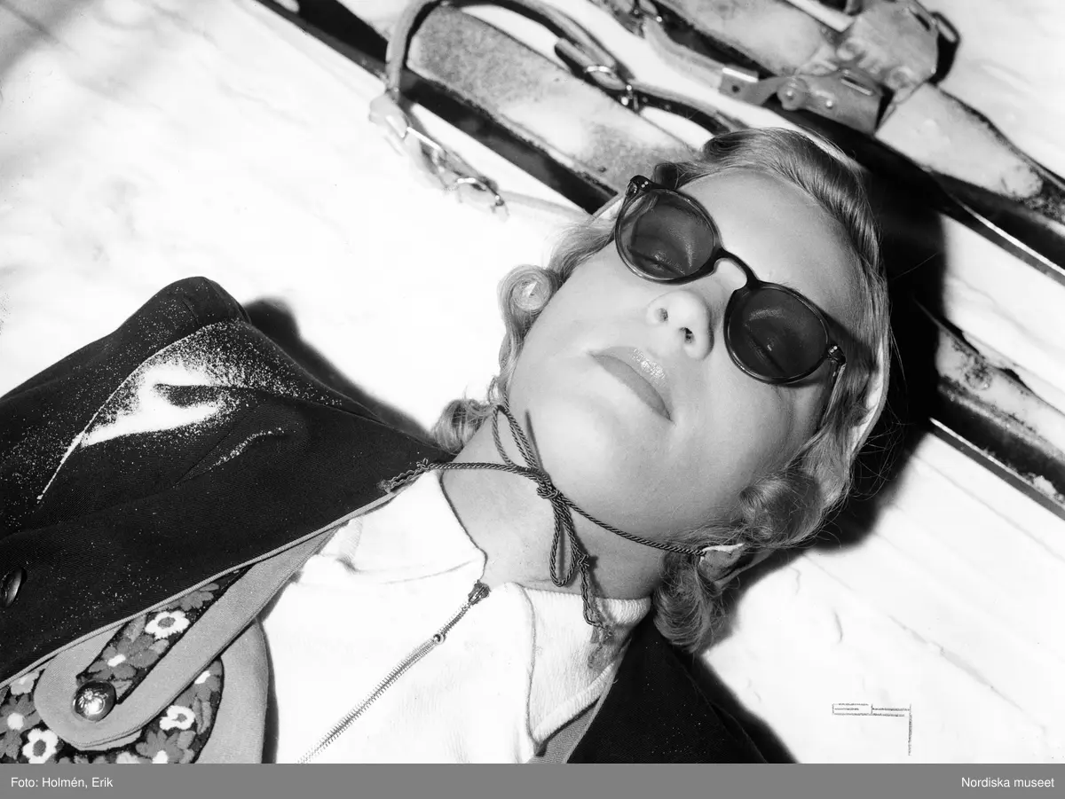 Modell i solglasögon och sportkläder, vit tröja och mörk jacka, mössa. Ligger på ett skidspår och solar ansiktet. Skidor i bakgrunden.
