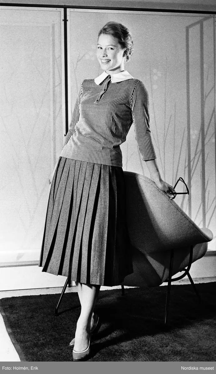 Modell klädd i randig jumper i rayon, 24,50 SEK och helveckad kjol i flanell, 39 SEK, samt pumps med vit rand. Modellen står på en matta och lutar sig mot en fåtölj. Glasögon i handen.