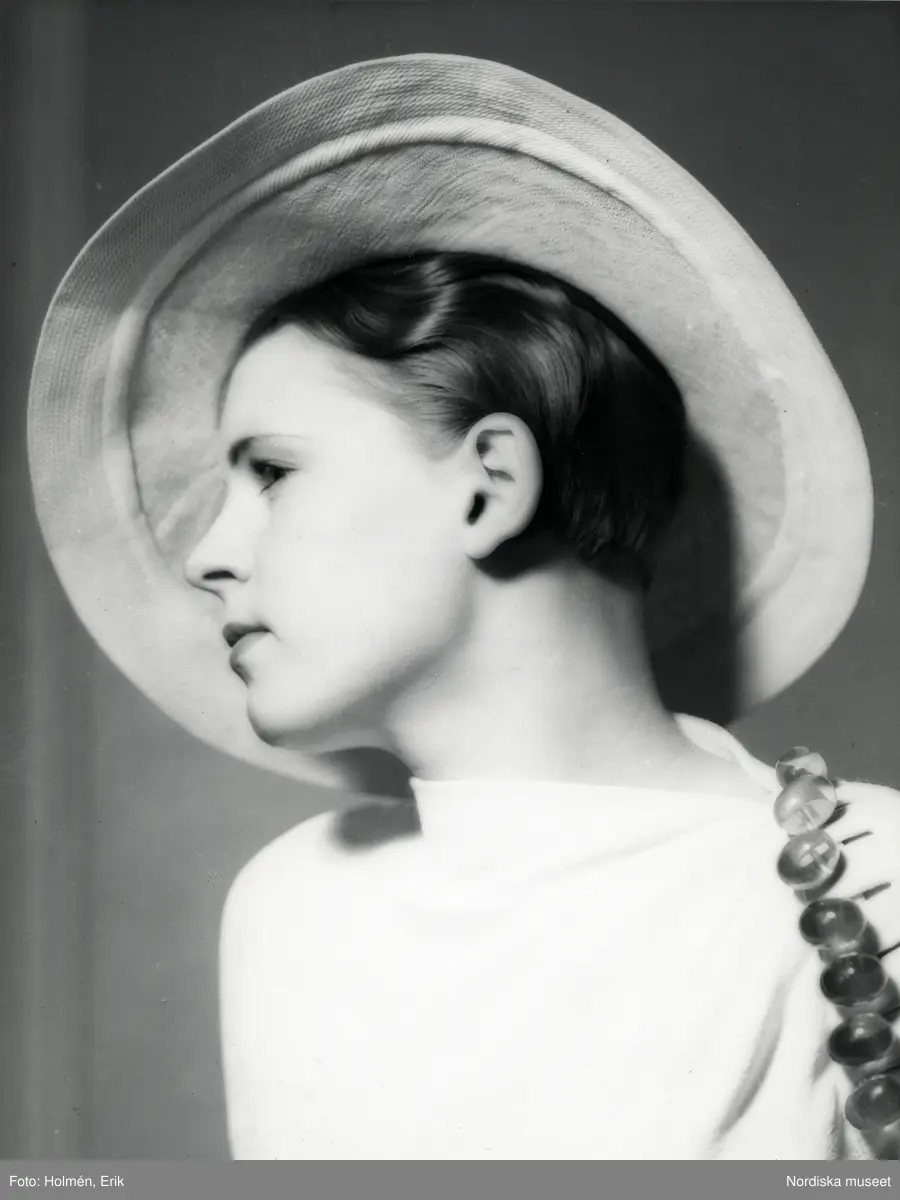 Kvinnlig modell i bredbrättad hatt och ljus överdel med knappar på sidan. Nordiska Kompaniet, Stockholm.