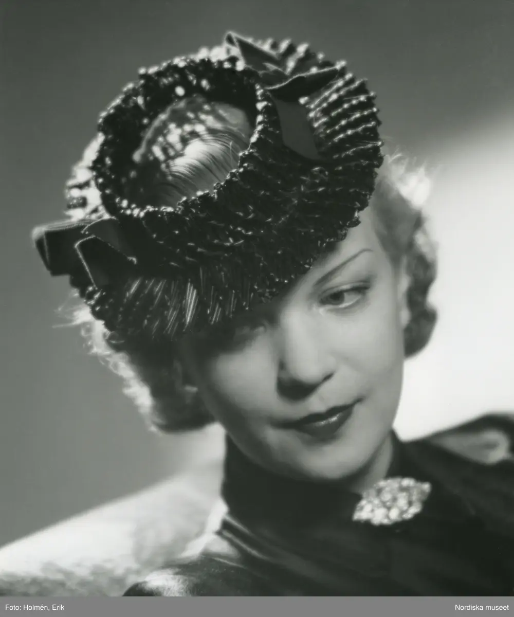 Porträtt av kvinna klädd i hatt med öppen kulle och rosetter, samt mörk blus och brosch.