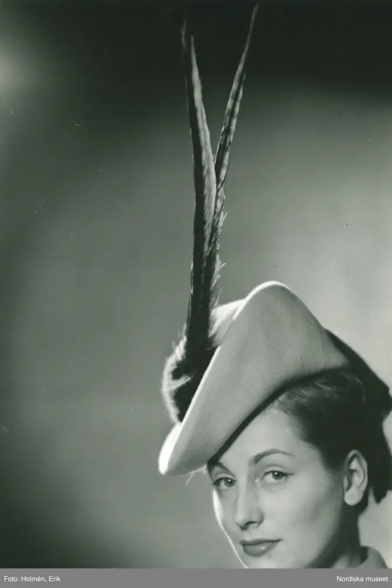 Porträtt av kvinna, Hjördis Grundel-Starenius, i hatt med höga fjädrar av Filbert Orcel.