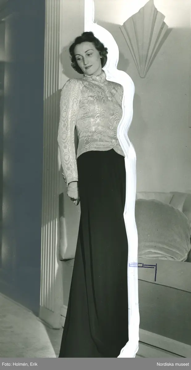 Helporträtt av kvinna i jacka och hellång kjol.