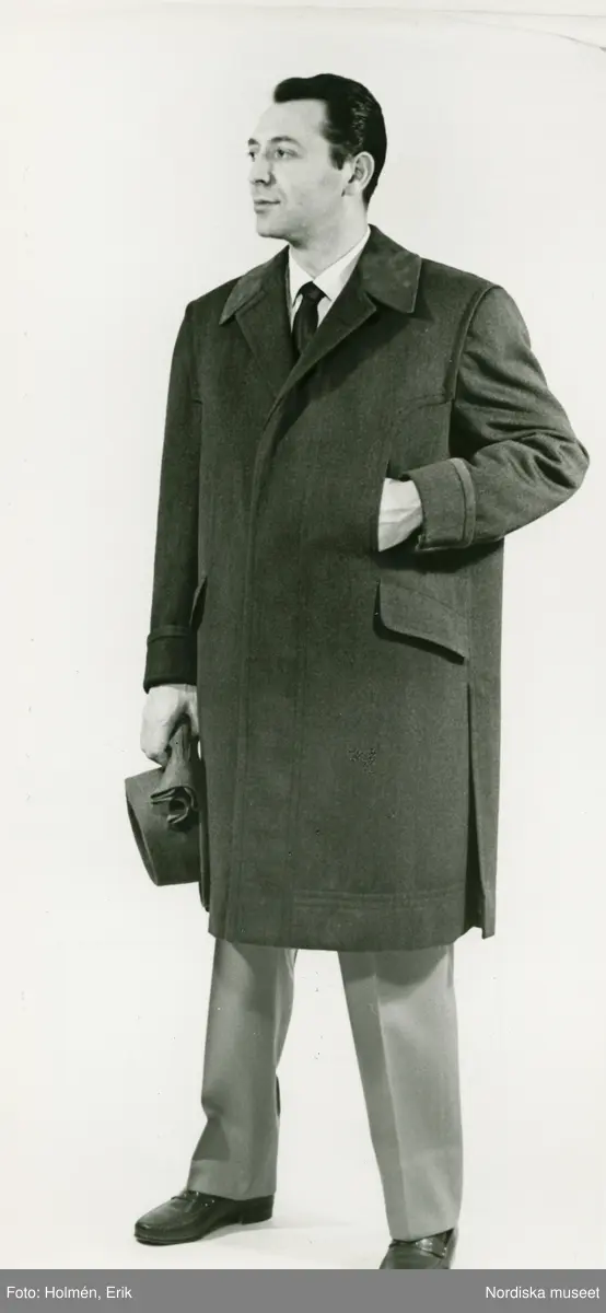 Helporträtt av man i kappa med hatt och handskar i handen.