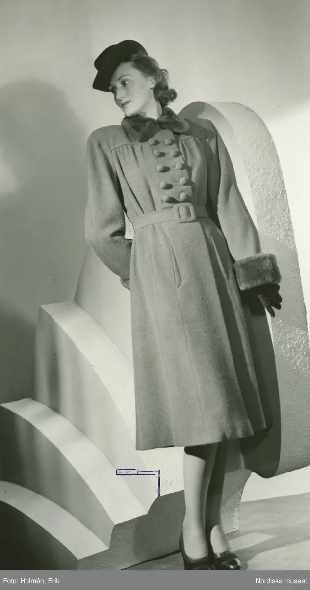 Helporträtt av kvinna i kappa med päls, samt hatt.