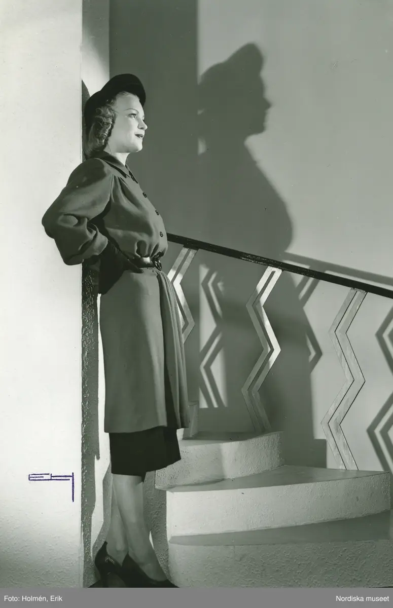 Helporträtt av en kvinna i kappa och hatt.