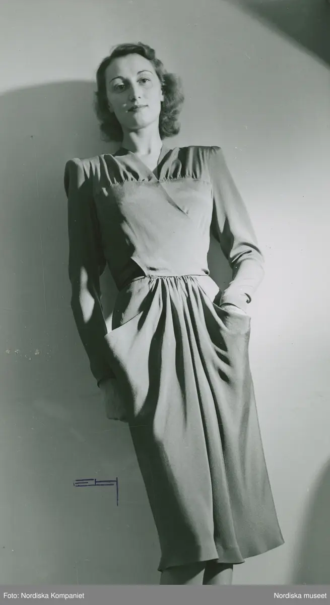 Modell i klänning med fickor och draperade detaljer.