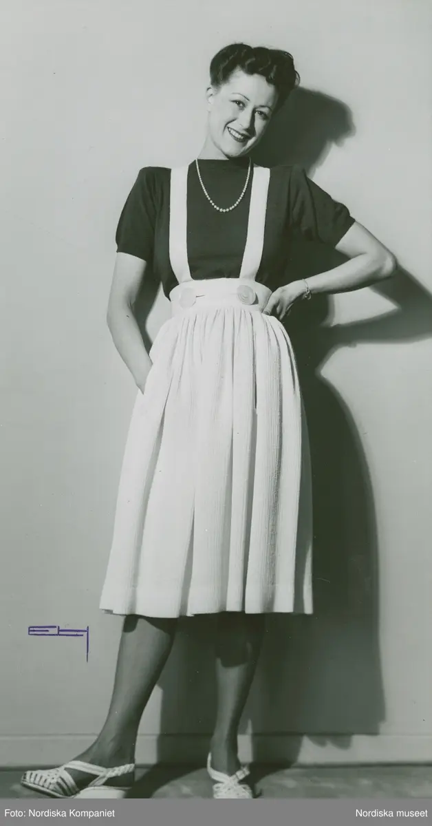 Modell i hängselkjol, kortärmad tröja med ärmpuff, pärlhalsband och sandaler med kilklack.