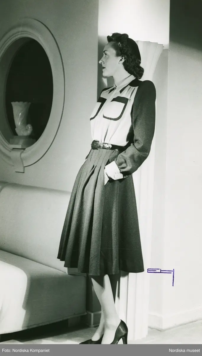 Modell i tvåfärgad klänning med skärp och fickor på bröstet.