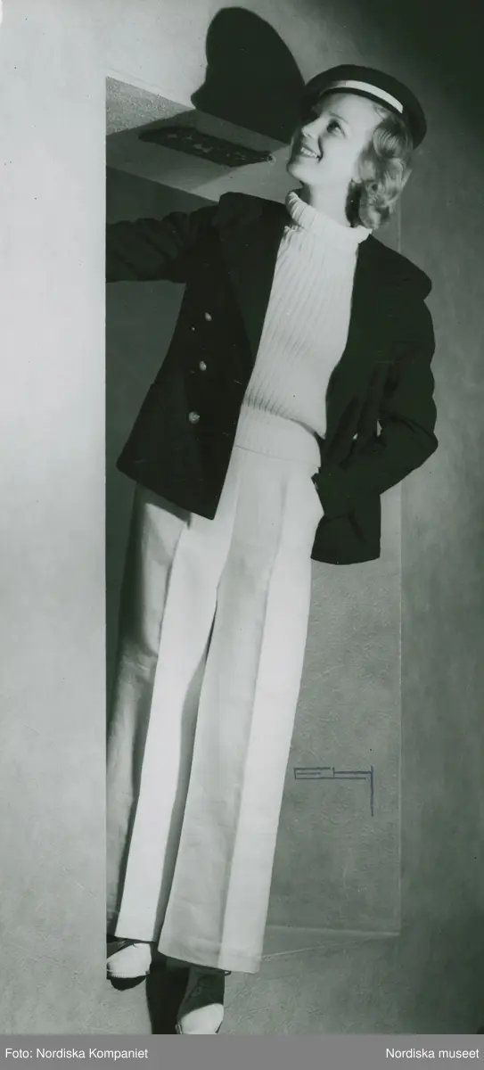 Modell i sportkläder. Skepparkavaj, polotröja, byxor med pressveck, snörskor och hatt.
