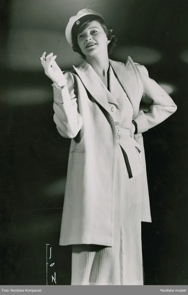 Modell i vit klänning, kappa, studentmössa, handskar och cigarett i handen.