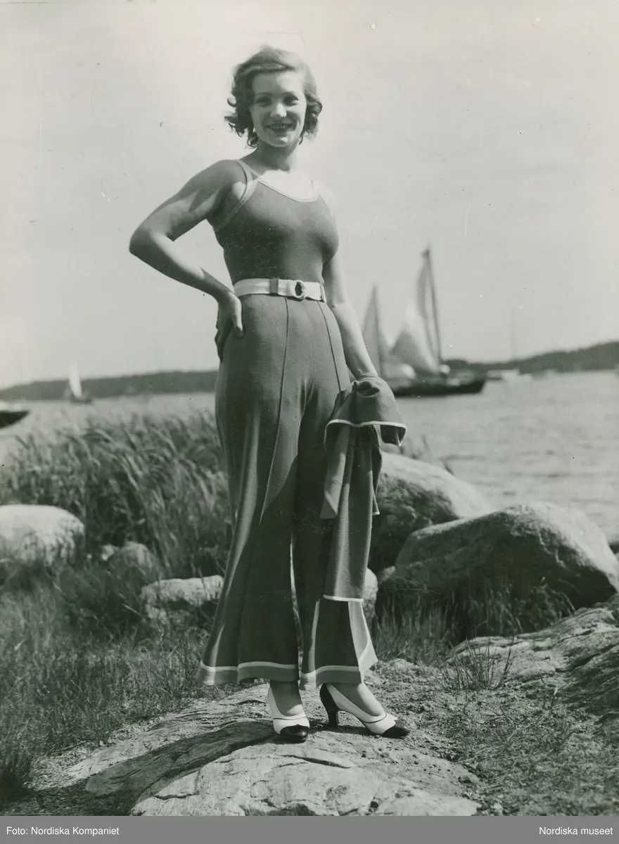 Modell i byxdress och pumps vid Saltsjöbaden, båtar i bakgrunden.