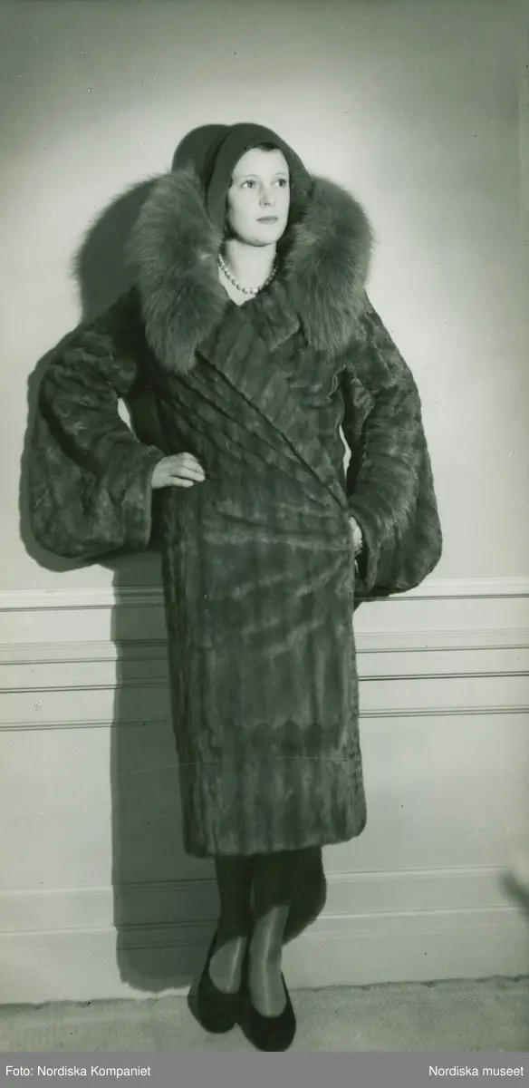 Modell i färgad hermelinpäls med krage av rävpäls, hatt och pumps.