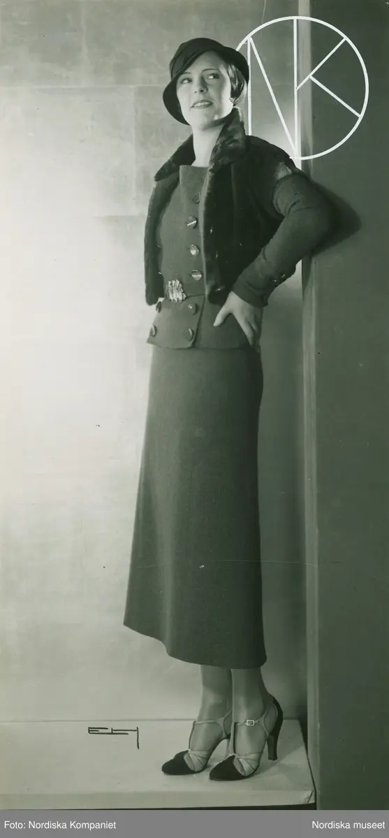 Modell i promenadklänning i beige ylle, pälsjacka, hatt och högklackade skor. Från Mainboucher.