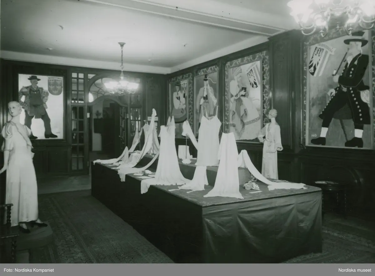 "Wienermodeschau" på Nordiska Kompaniet. Negligéer på ett bord.