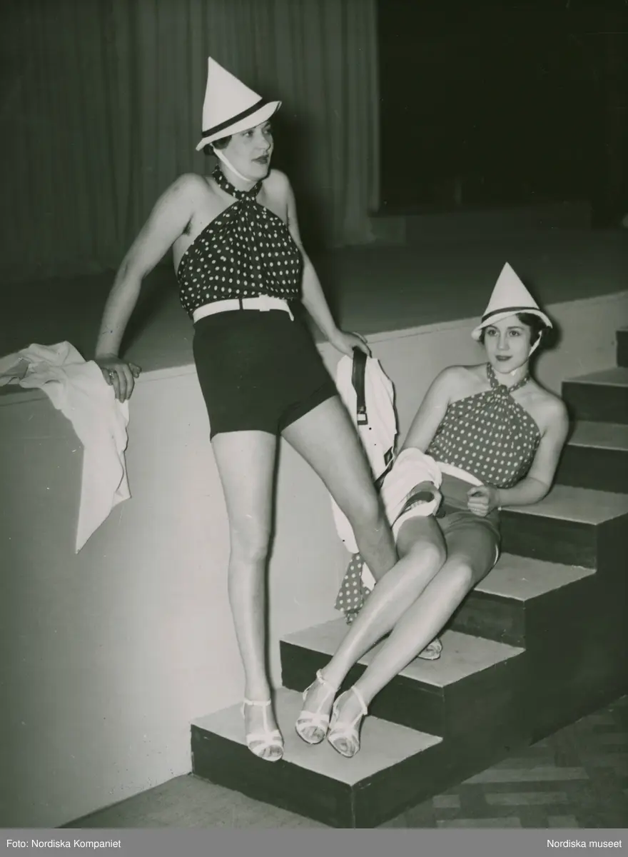 "Wienermodeschau" på Nordiska Kompaniet. Två modeller i shorts och prickiga linnen, sandaletter och hattar.