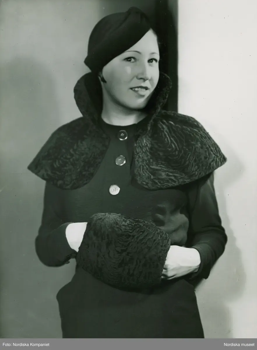 Modell i jacka med pälskrage och pälsmuff av klippt lamm, samt hatt.