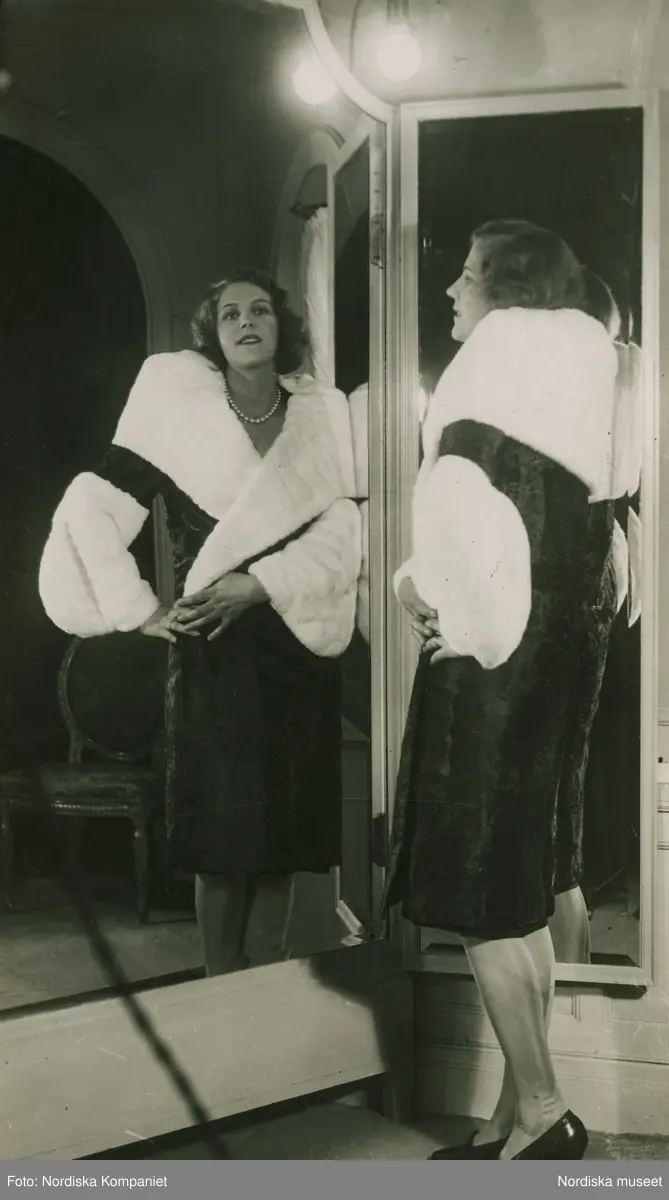 Modell i svart kappa av breitschwanz med krage i vit hermelin. Från Revillon Frères.