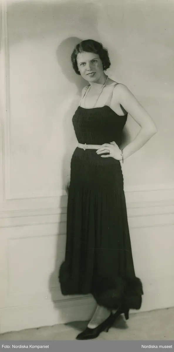 Modell i klänning från Lanvin, pälskant nedtill, pumps och pärlhalsband.