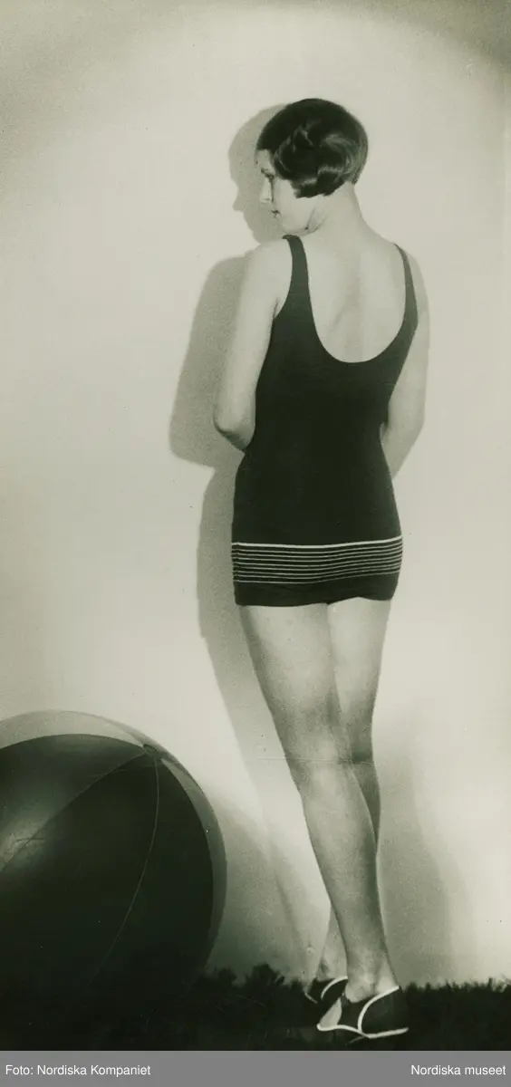 "Forma annonce." Modell i baddräkt vid en badboll.