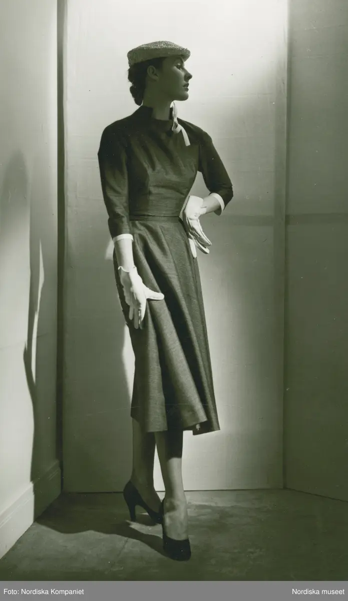 Modell i klänning, hatt, handskar och pumps.