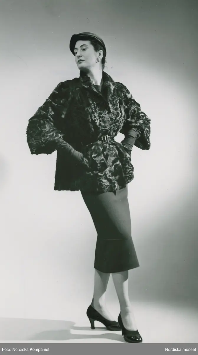 Modell i pälsjacka, pennkjol, hatt och pumps.