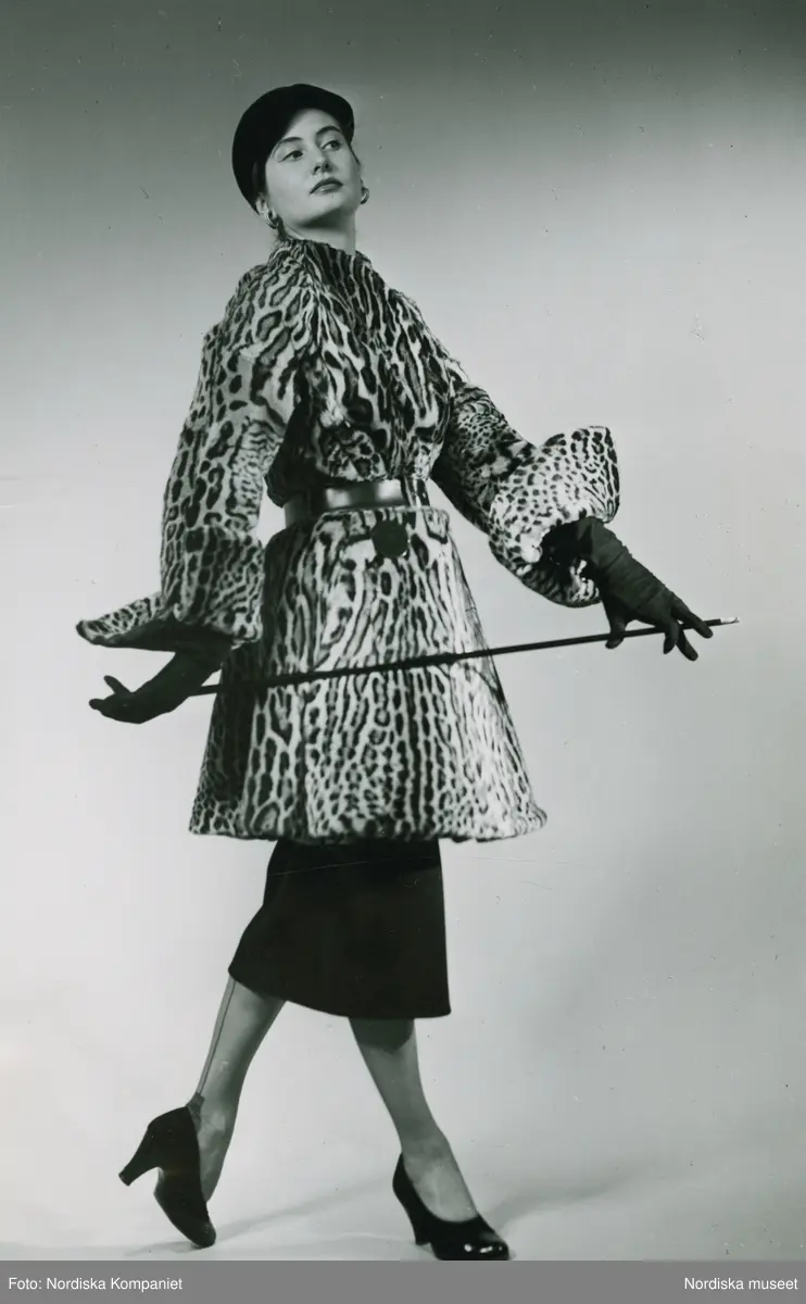 Modell i pälskappa av ozelot, hatt, handskar, käpp och pumps.