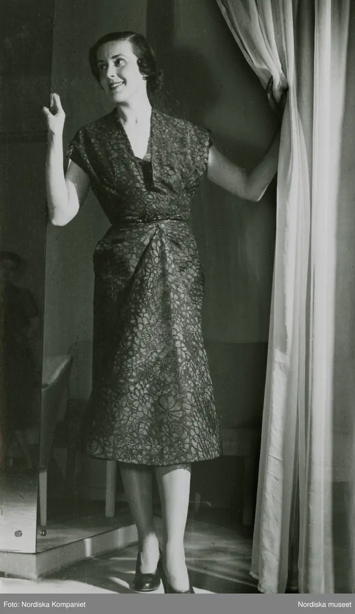 Modell i klänning med spets och pumps, vid en spegel och draperi.