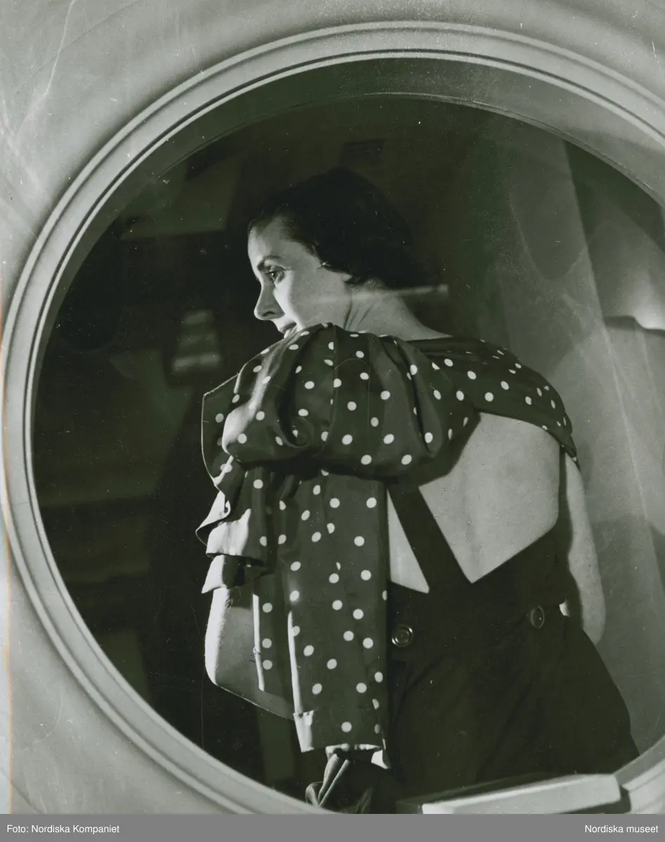 Spegelbild av modell i mörk klänning med prickig överdel.