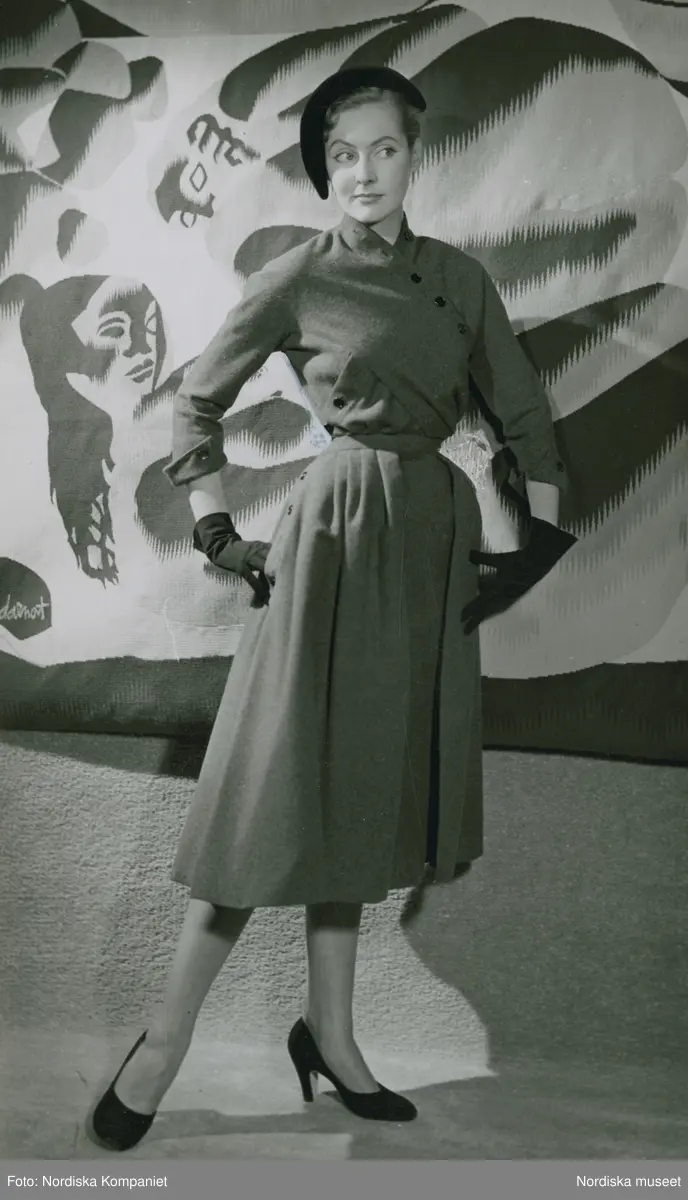 Modell i ylleklänning, hatt, handskar och pumps, framför textilkonstverk. Från Dior.