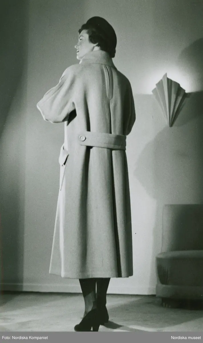 Modell fotograferad bakifrån, klädd i kappa, hatt och pumps.