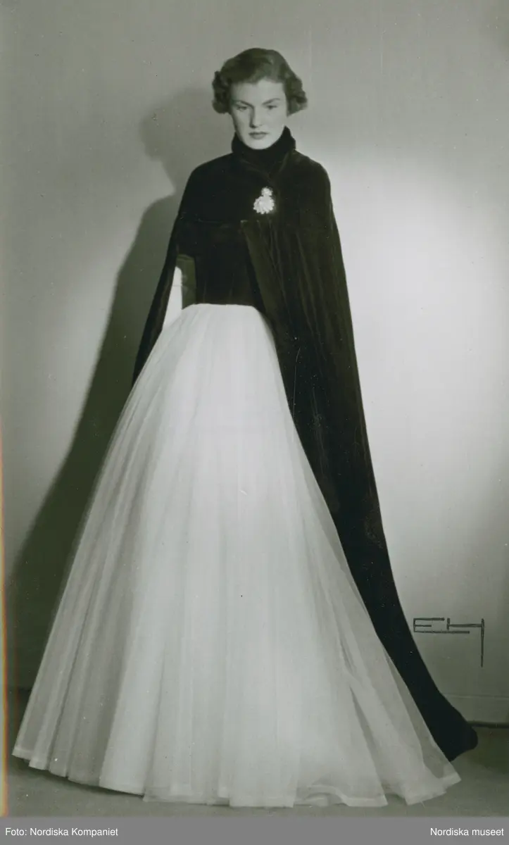 Modell i fotsid klänning med vitt tyll och hellång cape med brosch. Efter Balenciaga.