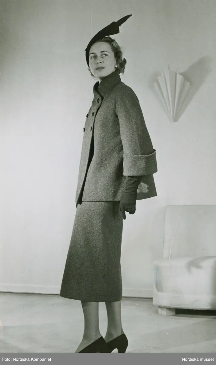 Höst/vintermode. Modell i dräkt, hatt, handskar och pumps av Jacques Fath.