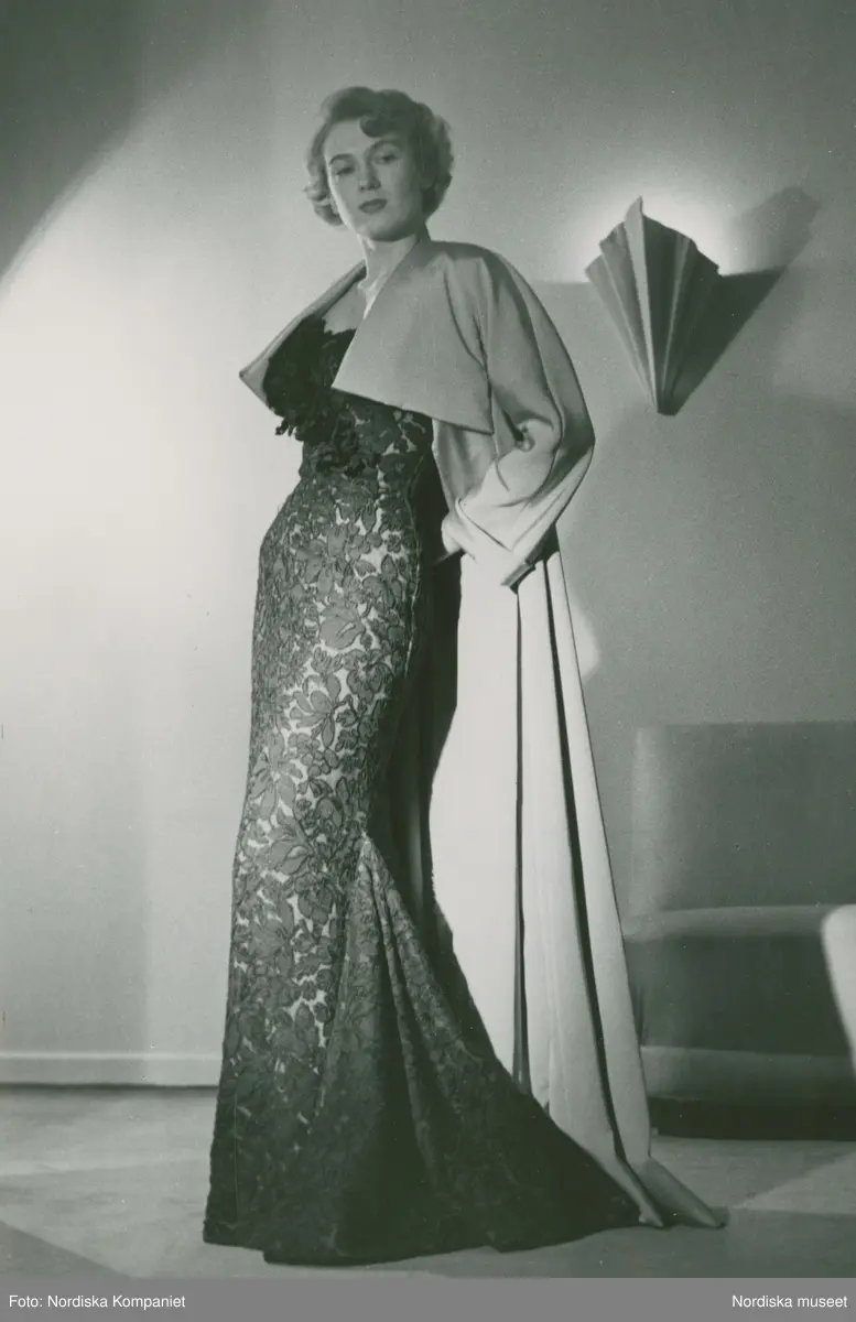Modell i mönstrad aftonklänning med släp och aftonkappa.