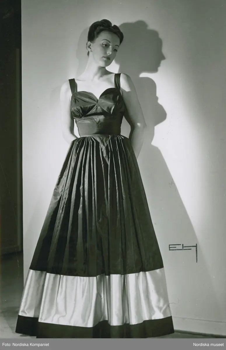 Mannekäng i aftonklänning från Jean Patou. NK:s Franska damskrädderi hösten 1947.
