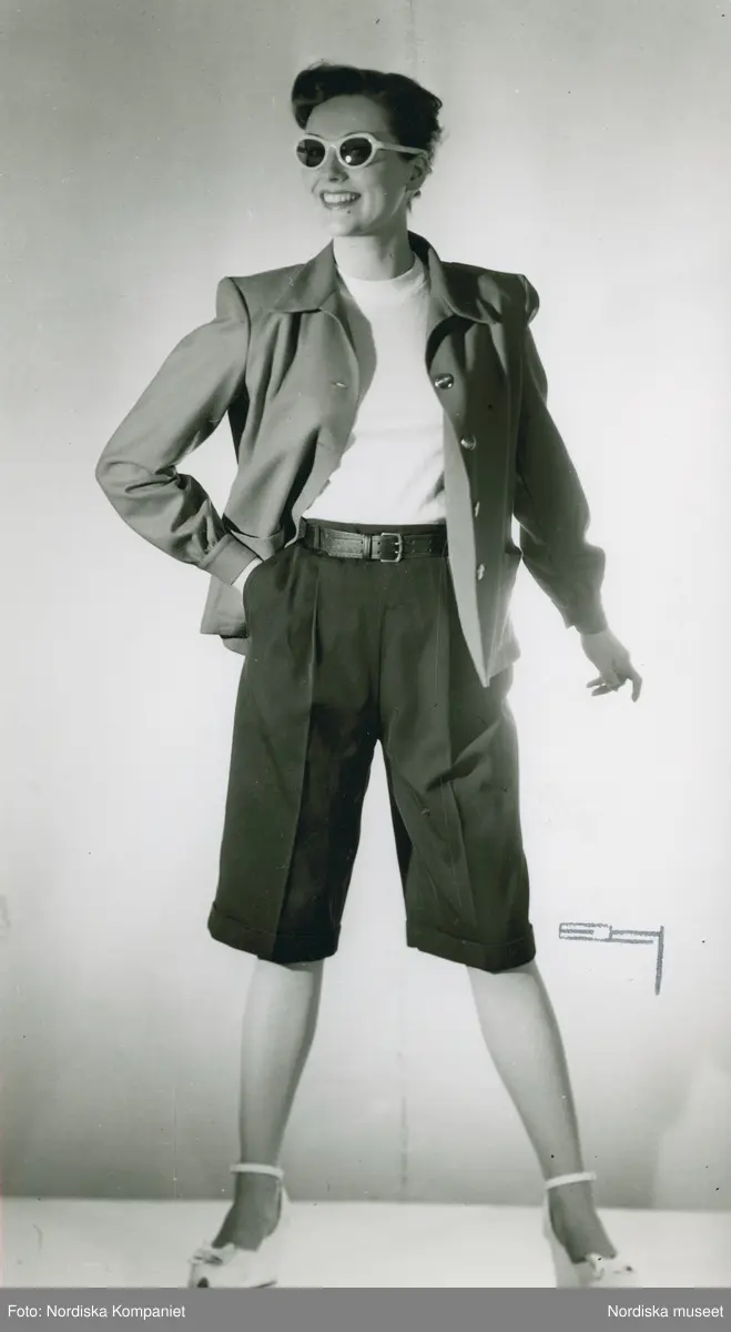Modell i jacka, jumper, shorts med pressveck, skärp, solglasögon och platåskor.