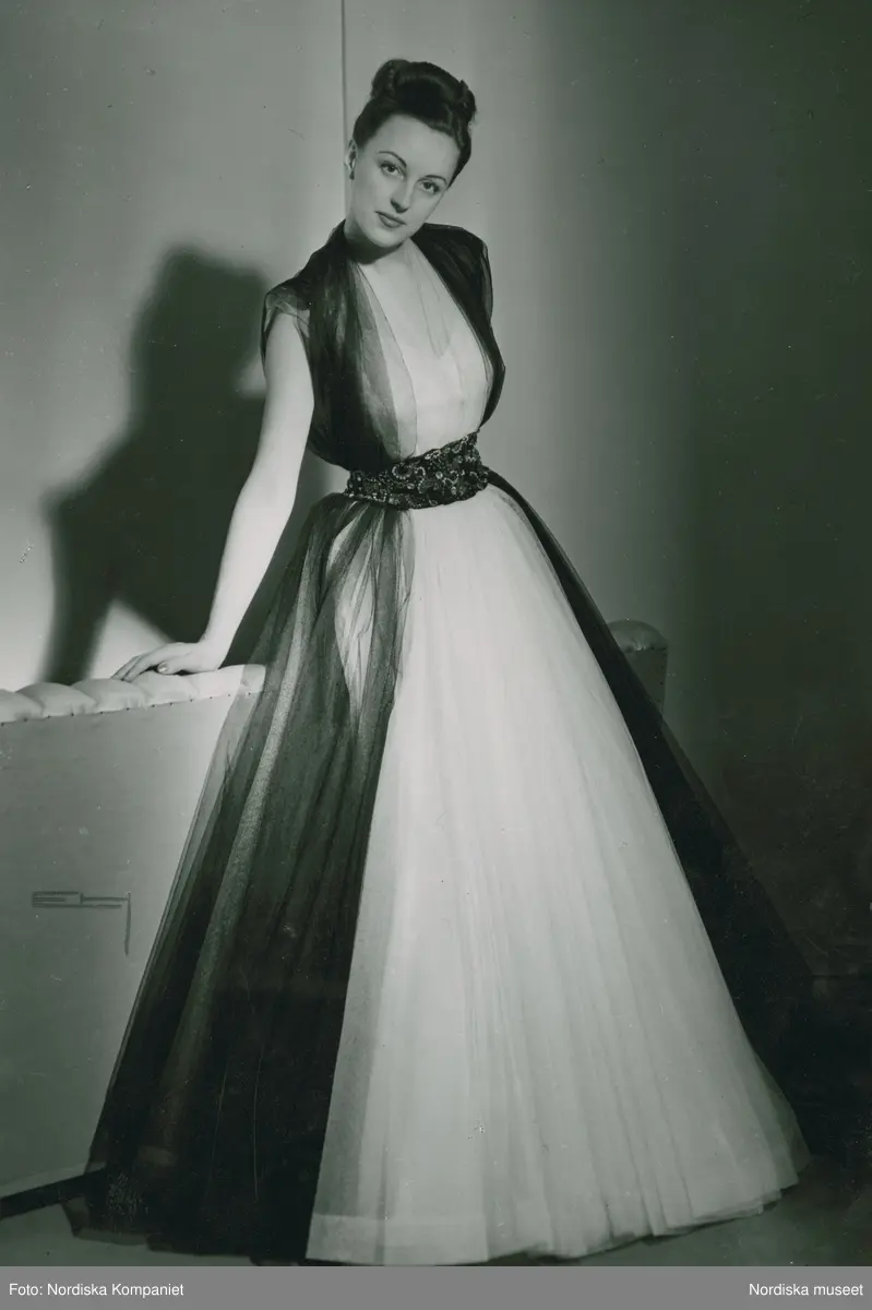 Mannekäng i aftonklänning med ljust och mörkt tyll och skärp med brodyr och pärlor. NK:s Franska damskrädderi.
