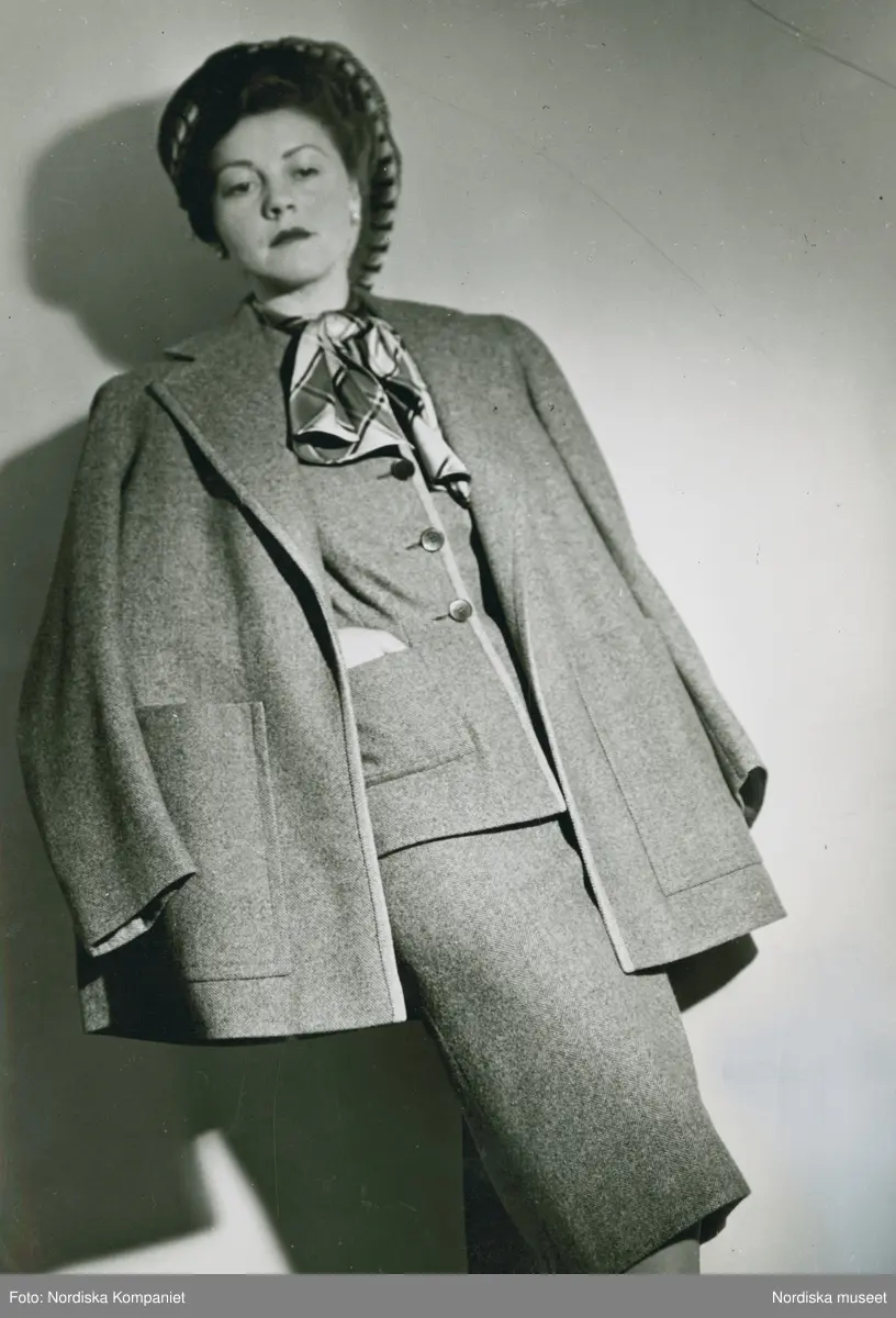 Modell i dräkt, rutig scarf och hatt, från Edward Molyneux.