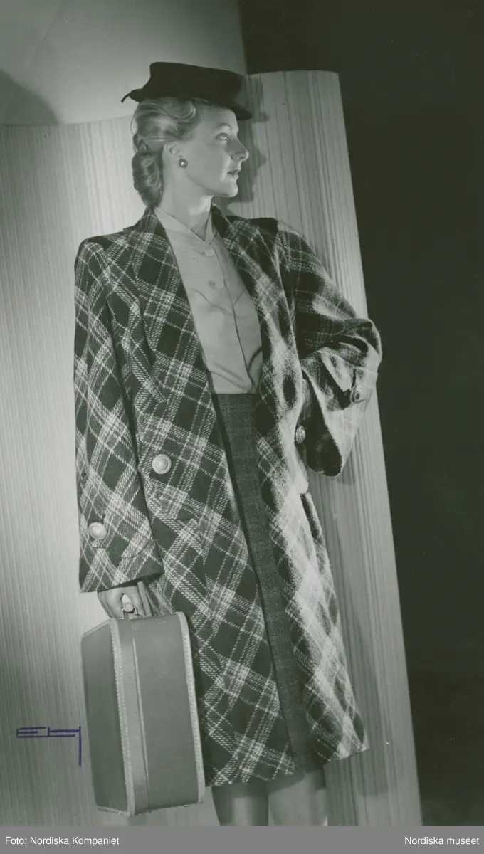 Modell i rutig kappa, blus, kjol, hatt och resväska i handen.