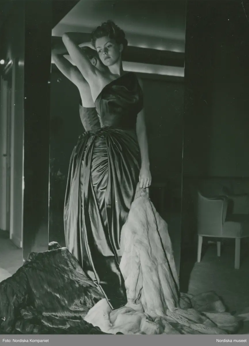 Modell i aftonklänning i siden, lutar sig mot en spegel och håller i en päls, bredvid ligger ännu en päls.