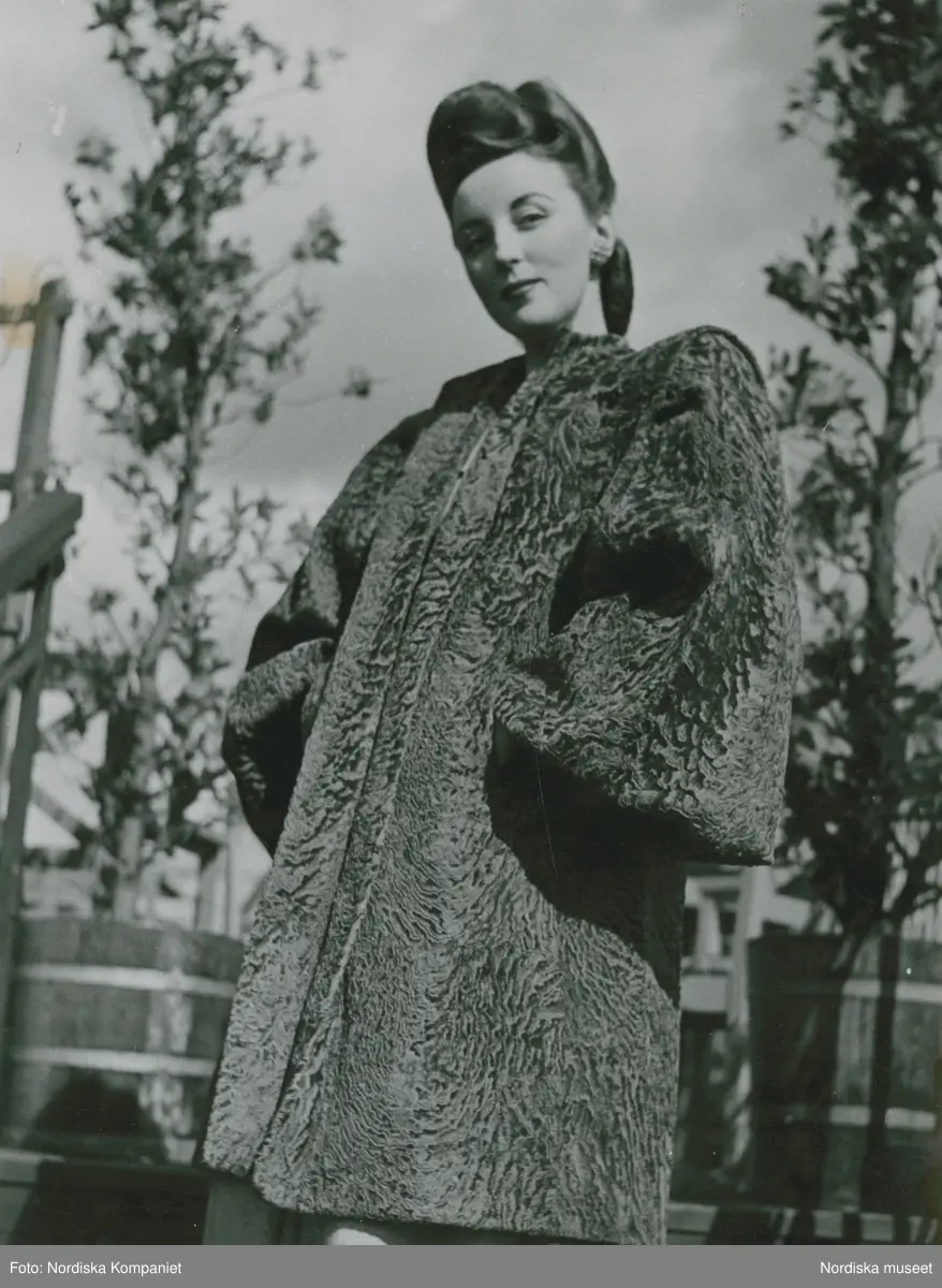 Modell i pälskappa och håruppsättning, träd i bakgrunden.