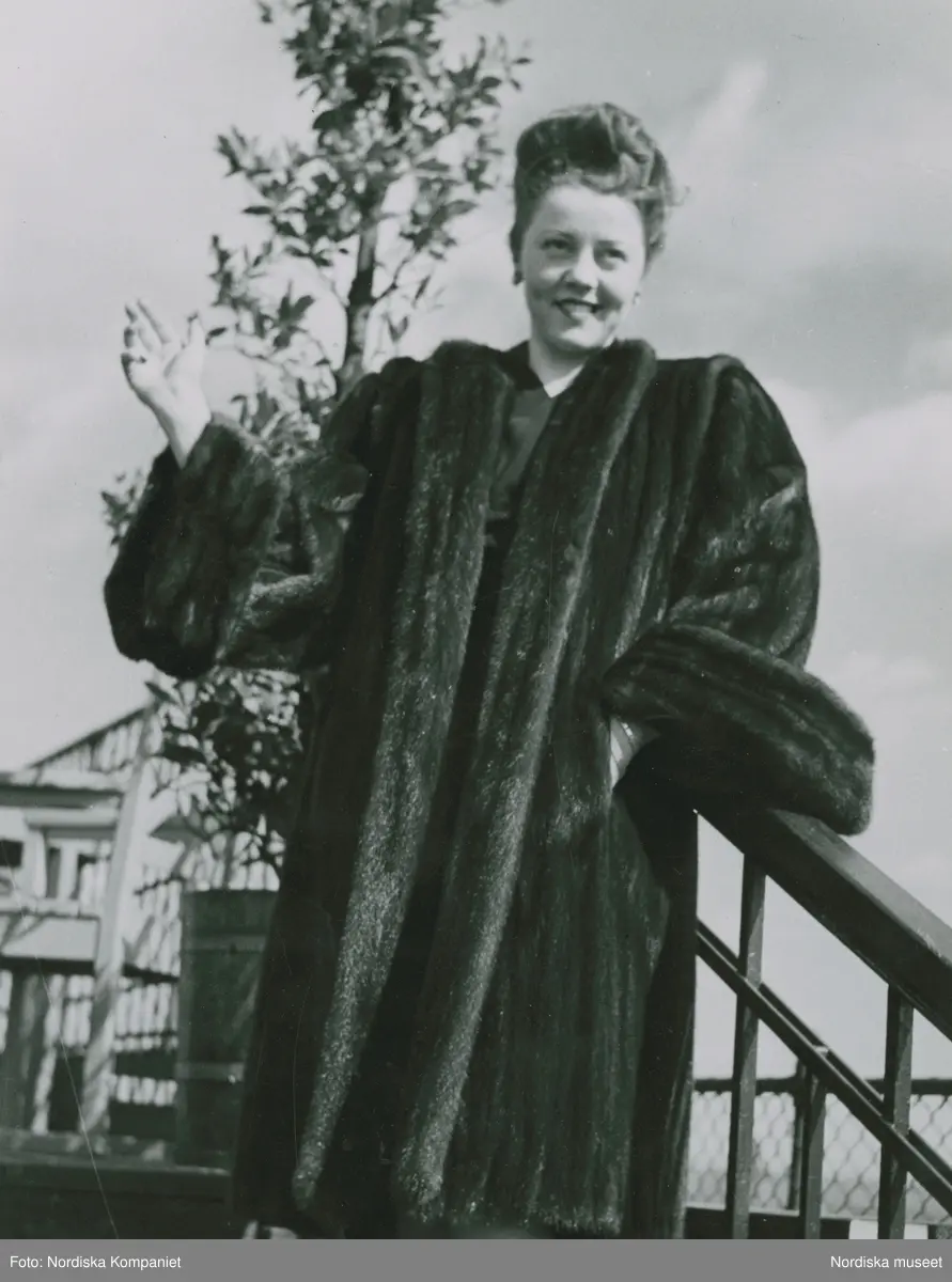 Modell i amerikansk päls och håruppsättning, på en trappa.