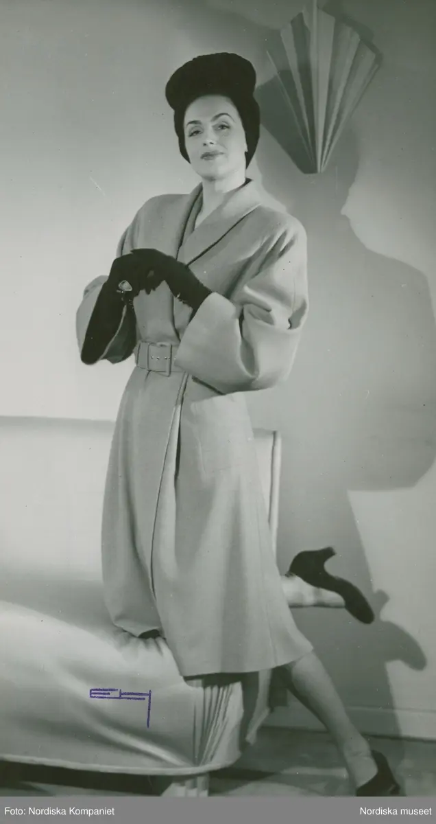 Modell i ljus kappa, turban, handskar och pumps, vid en soffa.