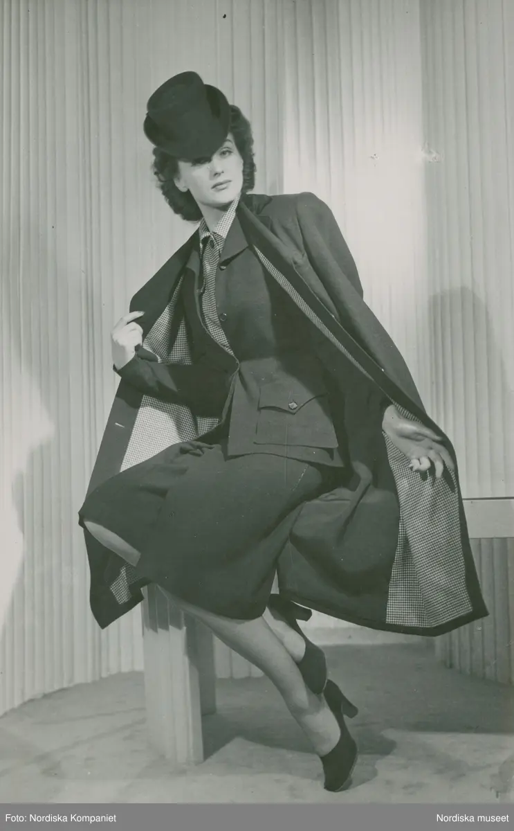 Mannekäng i dräkt, kappa, hatt och pumps. NK:s Franska damskrädderi.