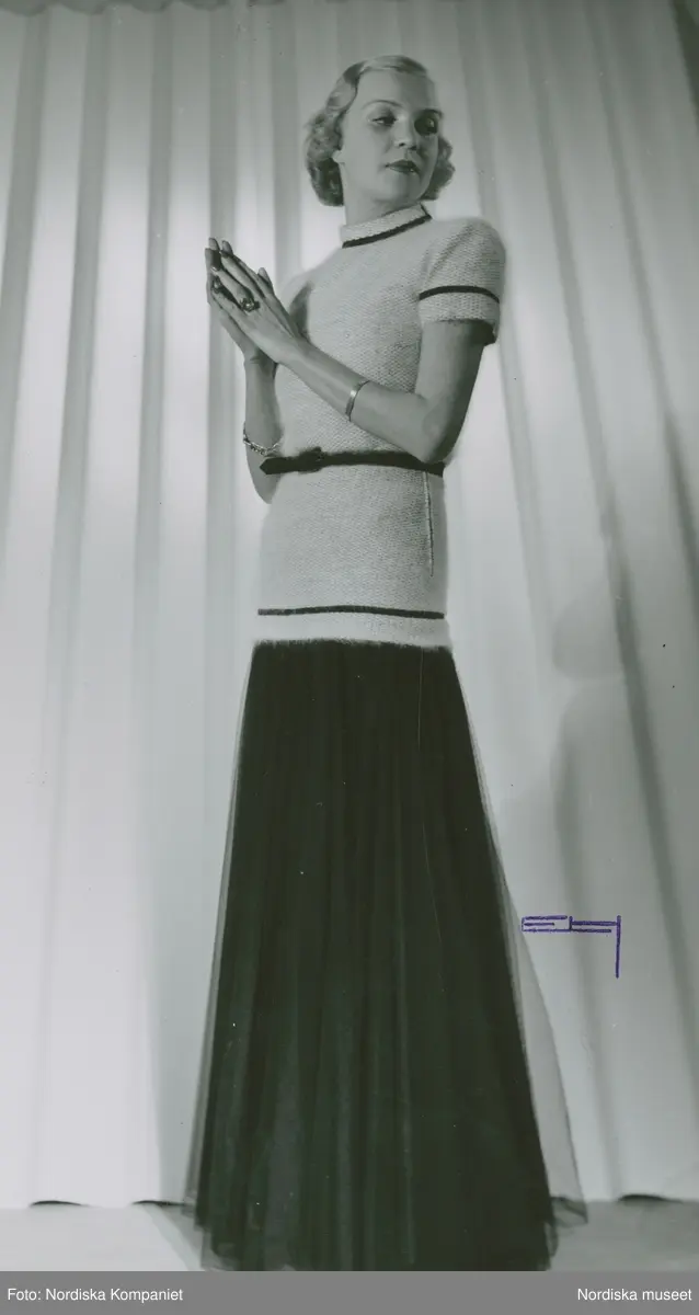 Modell i hellång klänning med överdel i ylle och kjol i mörkt tyll.